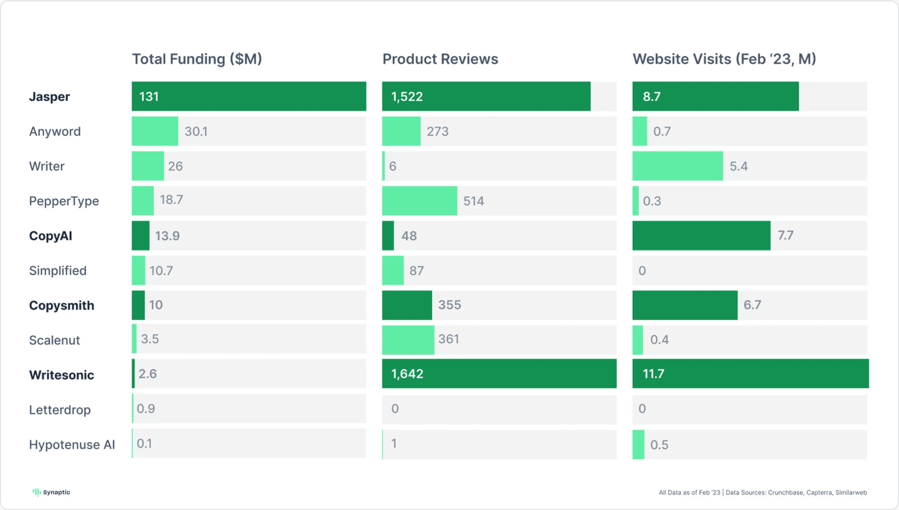 CopyAI and Copysmith have lost some of the momentum from their early fundraises and lag behind Jasper and WriteSonic. How they find a way to compete - catching up with leaders on product or building a niche, remains to be seen.