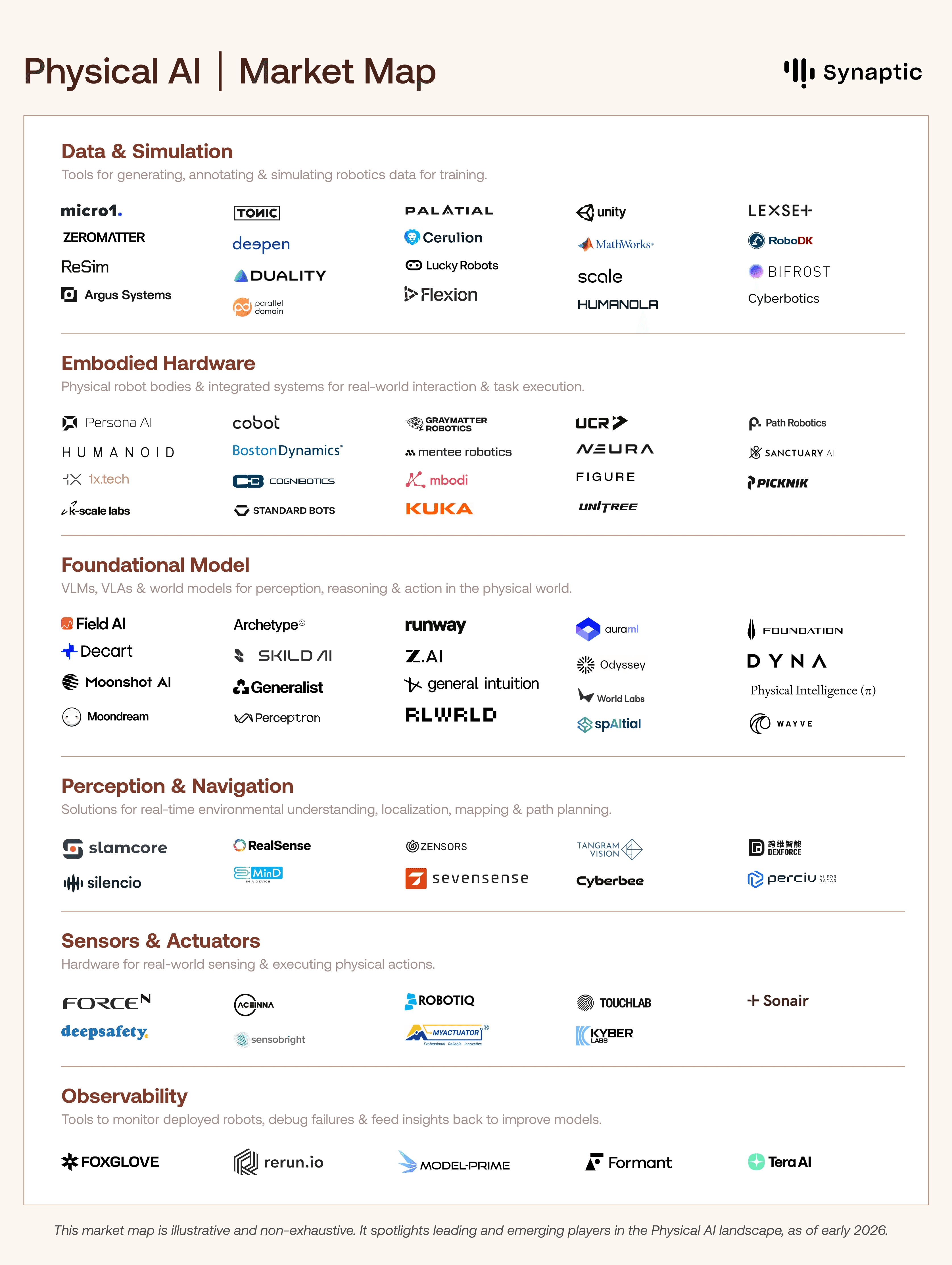 While the ecosystem is still young, with different archetypes racing along distinct paths, there are two major competitions ongoing: one for intelligence (foundation models, VLAs, world models) and one for embodiment (hardware design, manufacturing, and deployment at scale).
