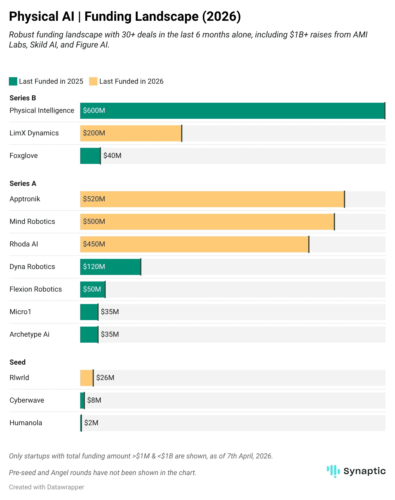 Mind Robotics (Rivian spinout) and Rhoda AI each raised $450–500 million Series A rounds.