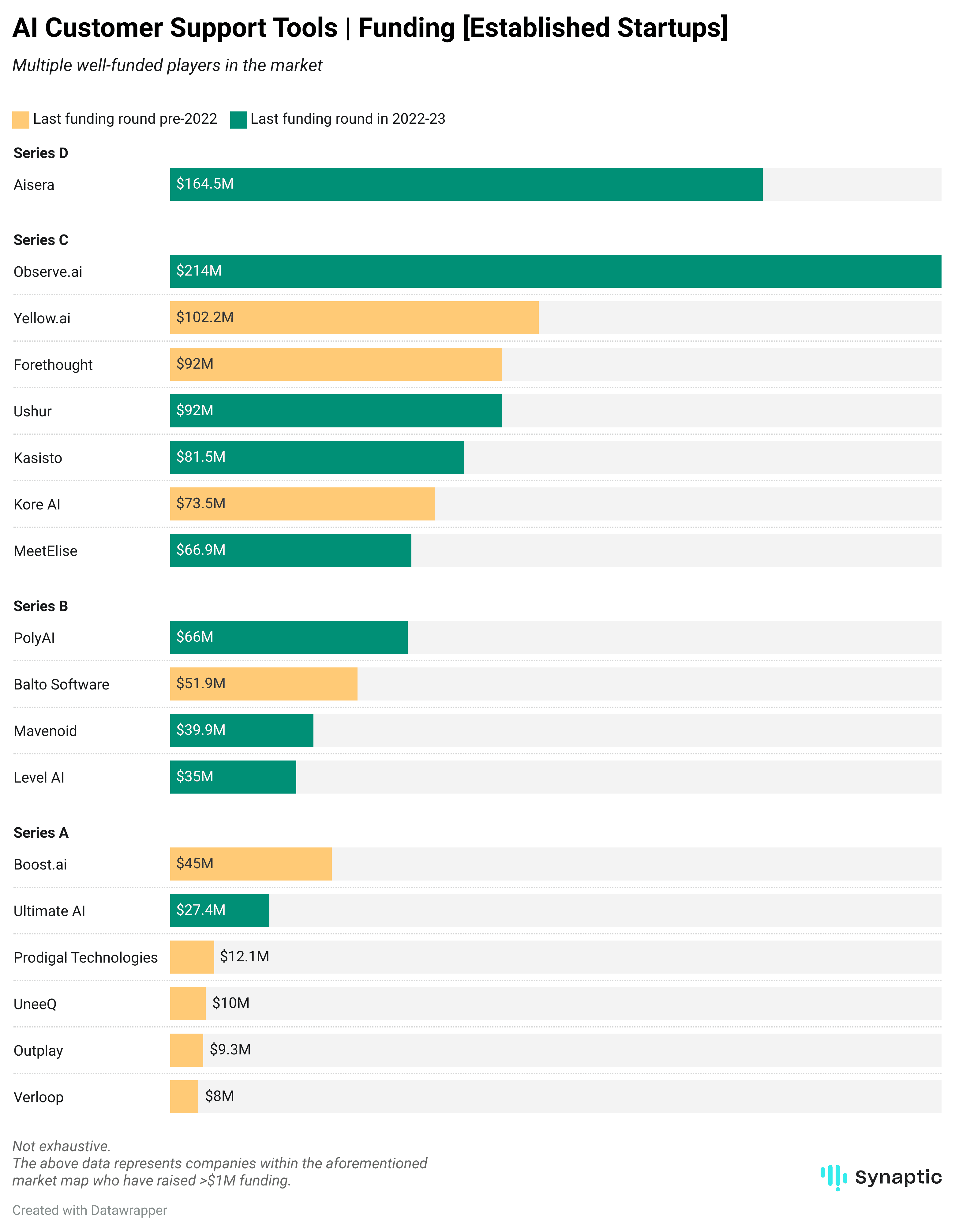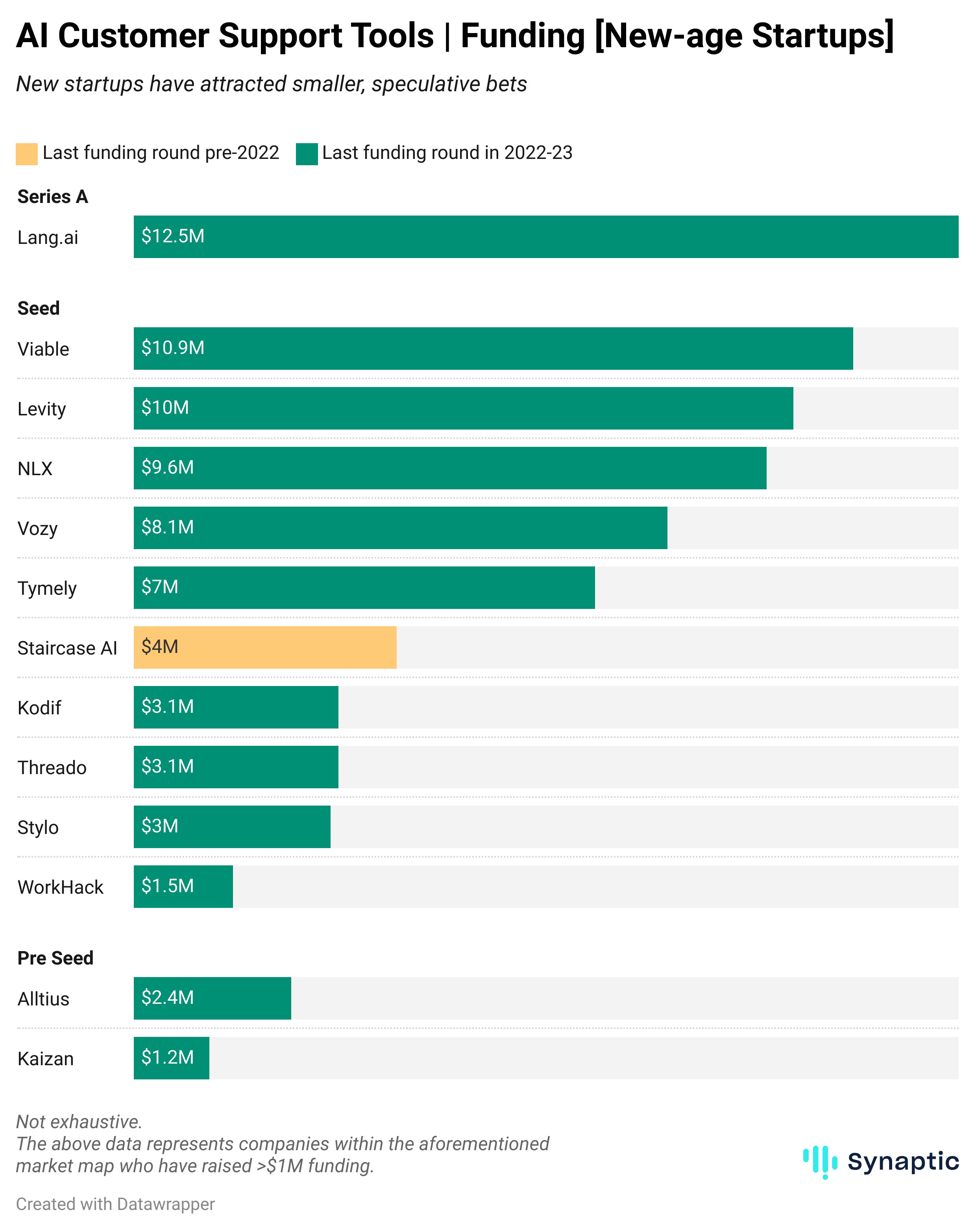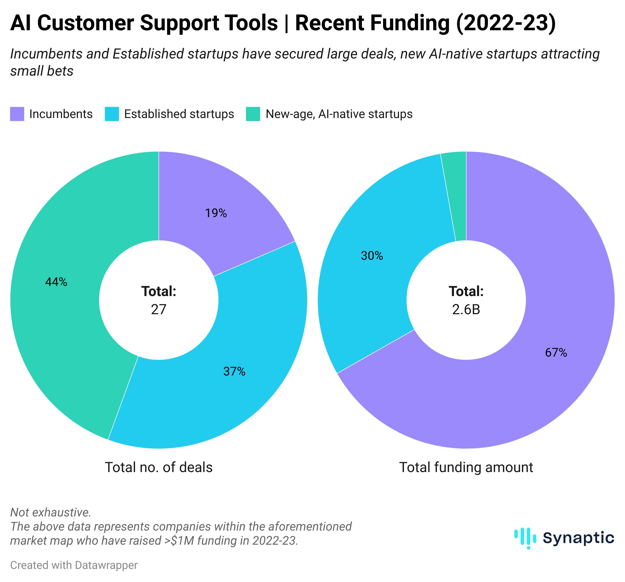 Compared to markets like AI Copywriting and AI Video Tools where new AI-native startups led innovation and were able to scale substantially (e.g. Jasper, Synthesia etc.), the AI innovation in customer support is being driven by incumbents and established startups. The set of new players is nascent in terms of adoption and funding. This trend is driven by -