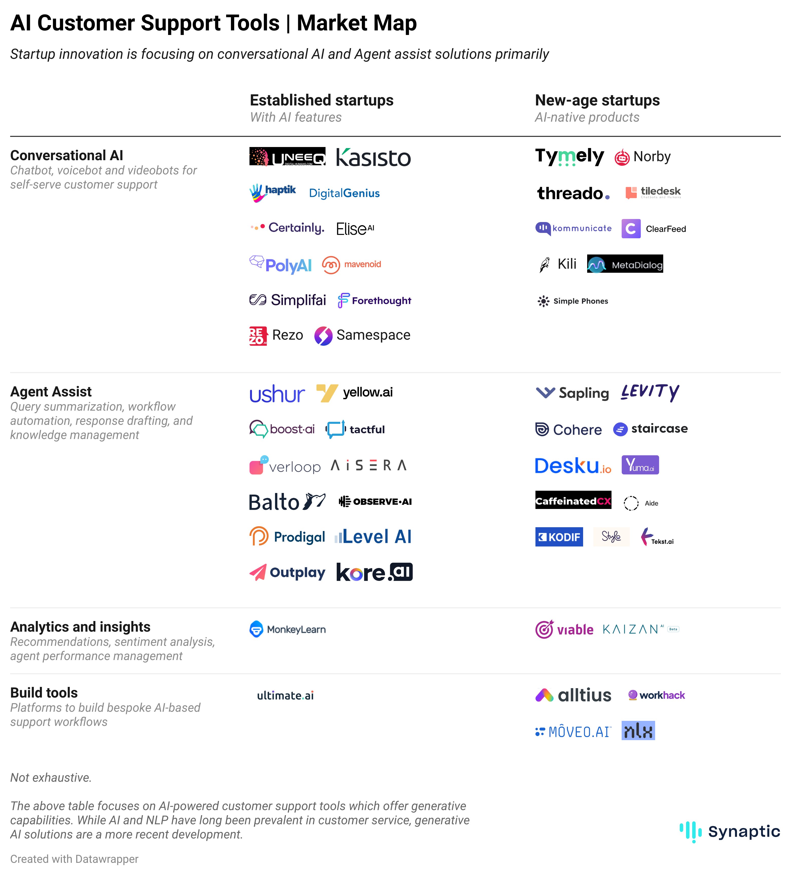 Most incumbents in this sector are offering comprehensive, 360-degree solutions that address a wide range of support needs – multichannel conversational support, ticketing and workflow automation, agent support and productivity tools, and customer experience insights. Startups (both new and established) are typically focussed on point solutions such as AI chatbots, response drafting, query summarization etc. and focus on specific channels / modalities.
