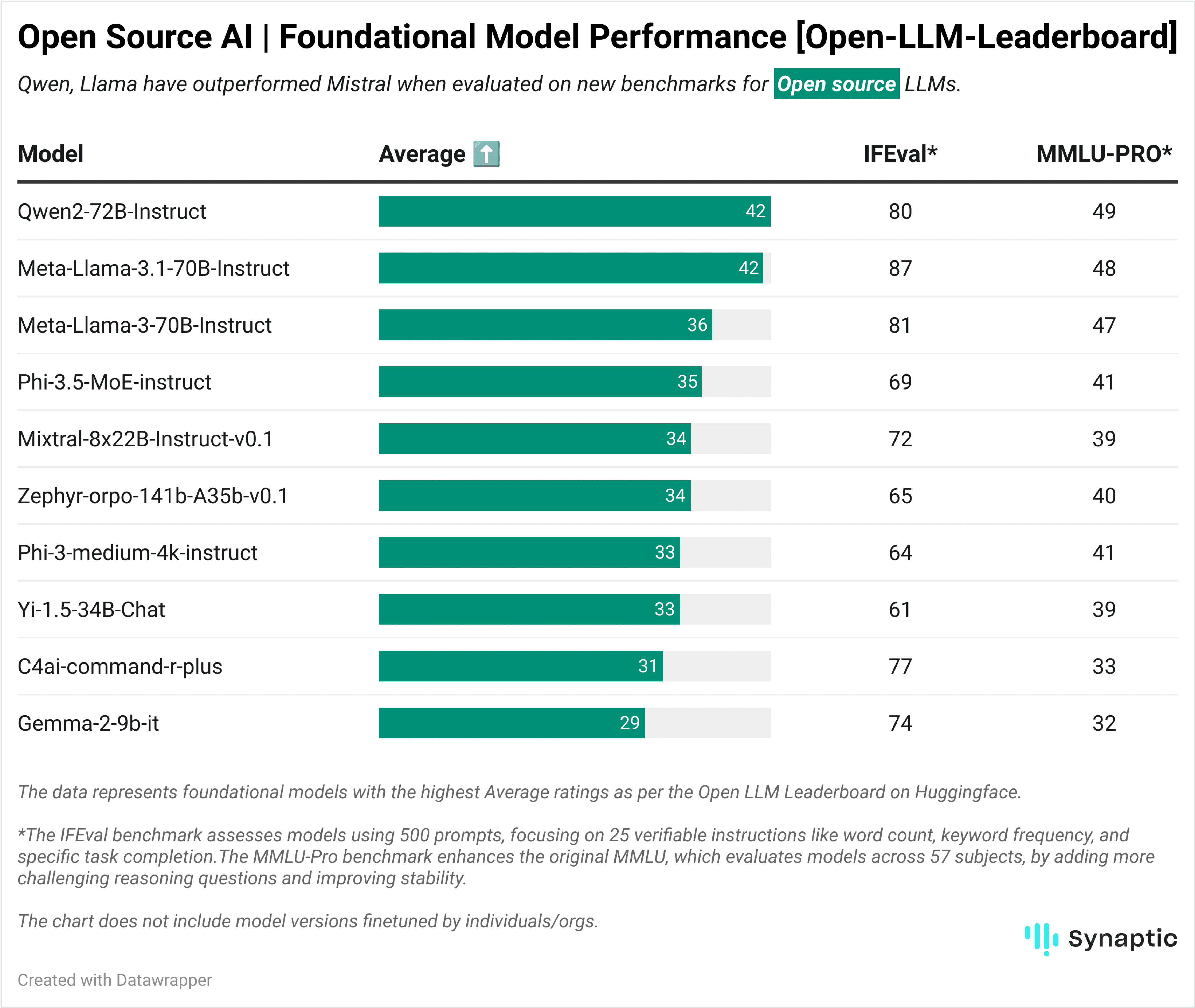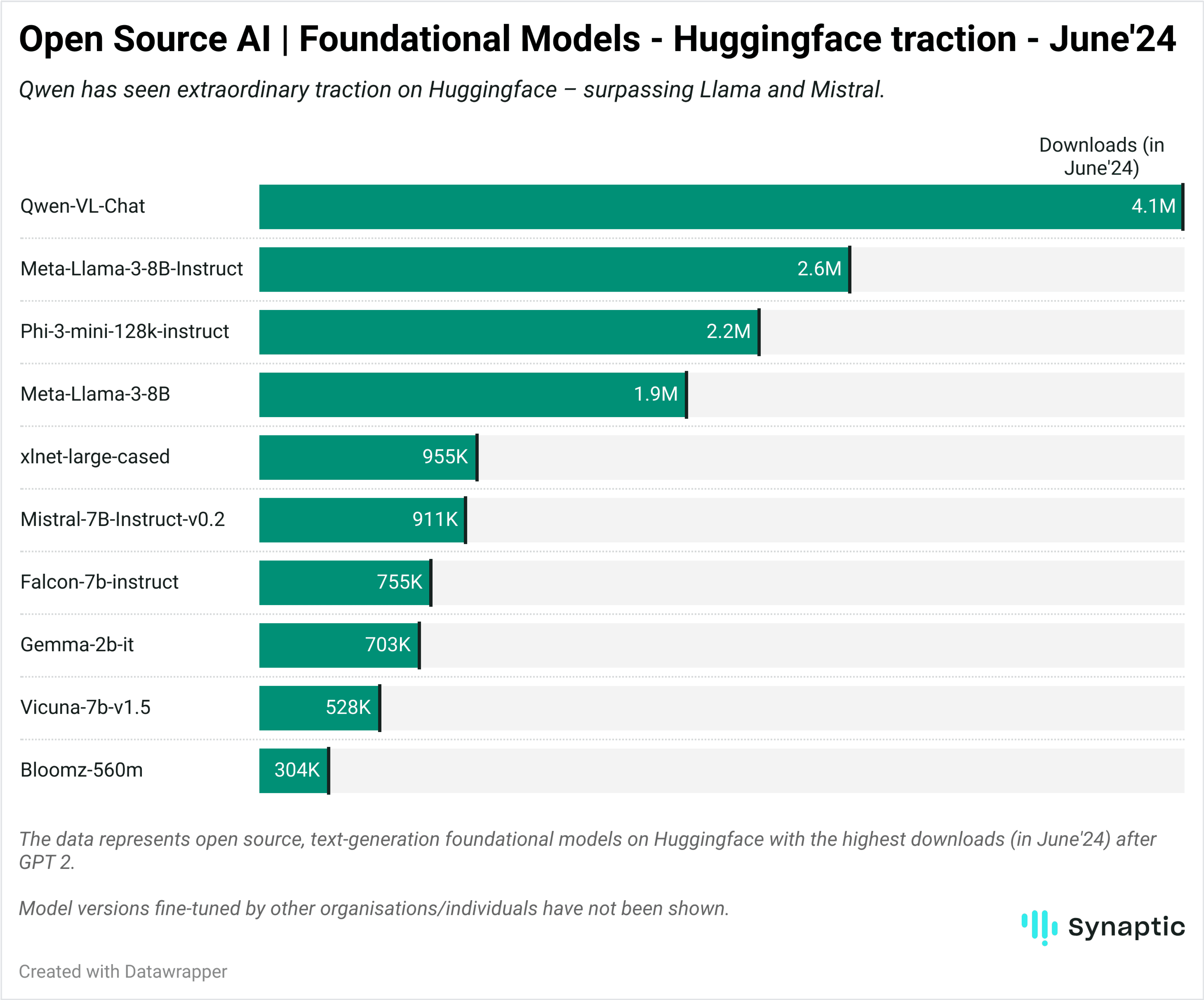 Open-source models like Mistral and Llama have established a strong foothold in the AI community, rapidly evolving with efficient versions that consistently match or outperform top proprietary models like GPT and Claude in various benchmarks. Other open-source models, such as Qwen and Yi, are also quickly catching up in performance.OS has moved past the AI hype cycle trough; steady growth in developer engagement continues