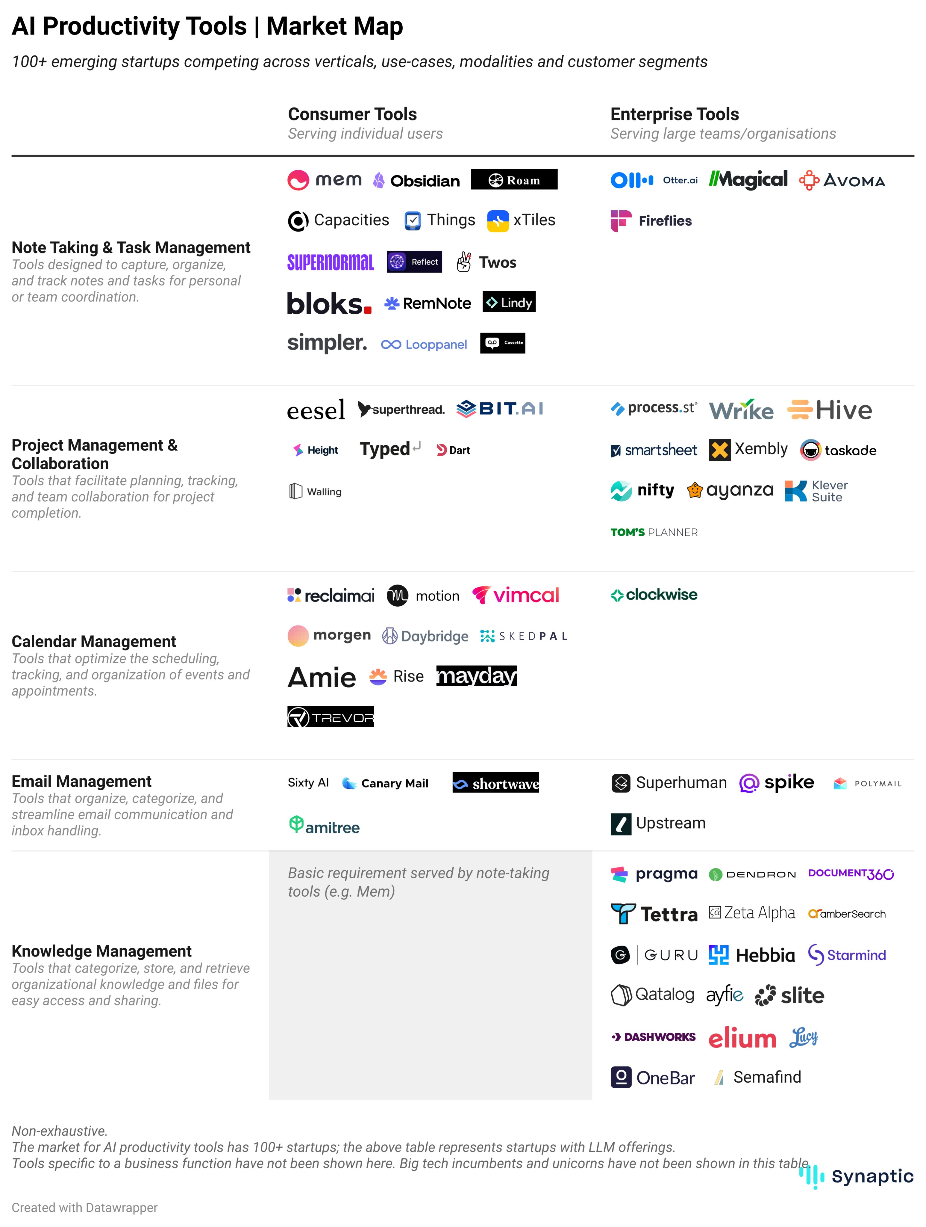 Similar to the AI video tools (~50 AI-native startups) sector, the AI productivity tools sector has a large lower-end market with a diverse set of individual / SMB use cases - an ideal building ground for startups to build market presence, iterate on product and eventually break into enterprises. Productivity tools, in particular, has been a space where the individual usage can drive enterprise sales. Unicorns like Notion, Airtable and many others started out serving individuals, building a strong product which those individuals eventually pitched to their employers