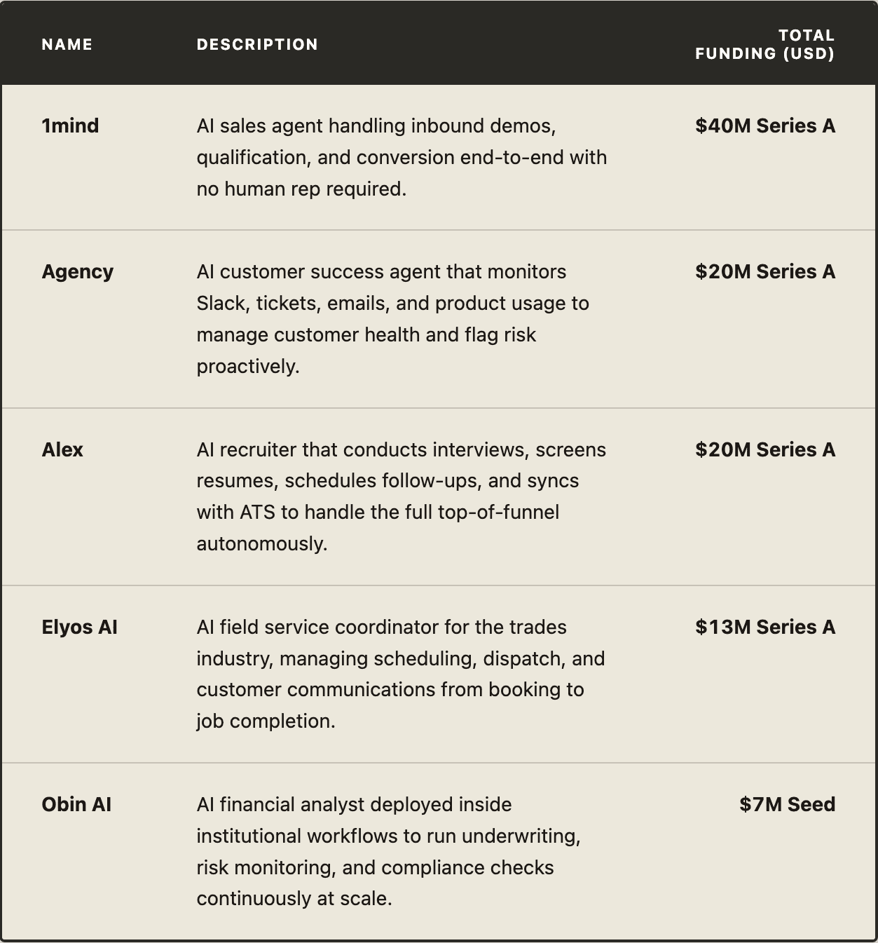 Recently funded founders building AI agents to autonomously own and execute professional workflows end-to-end.