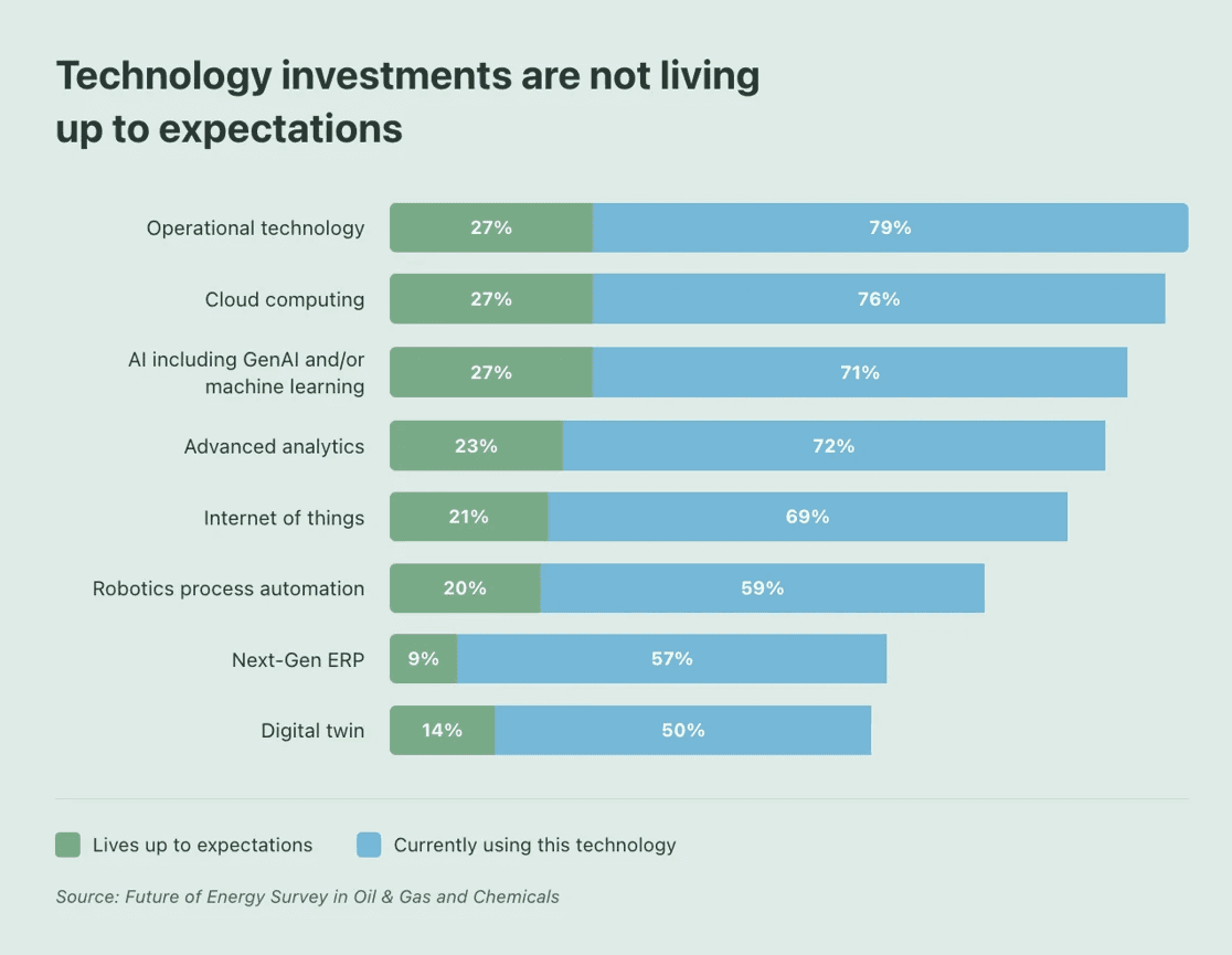 Yet, adoption lags. EY's 2025 Future of Energy Survey reveals that technology investments are falling short, with only 71% of firms having adopted AI.